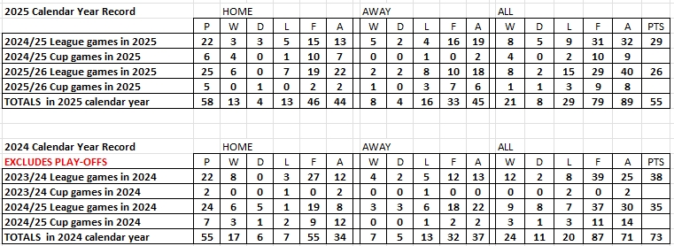In 2024, the 46 games which were played across the latter part of the 2023/24 campaign and the first part of the 2024/25 season, produced a much better points haul of 73 points, gleaned from 21 wins, 10 draws and 15 defeats or 1.59PPG.